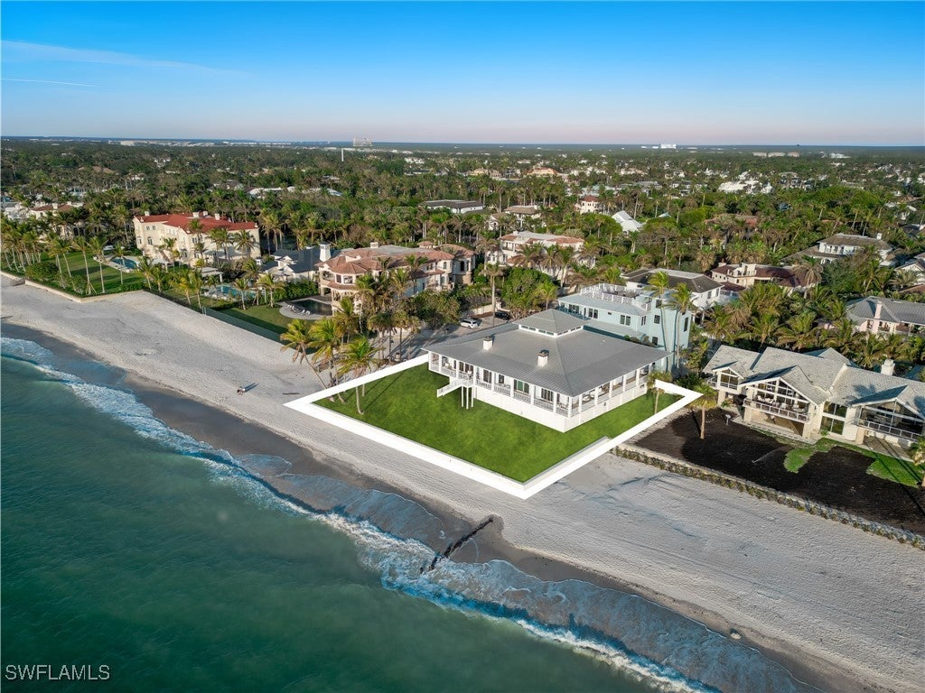 With sweeping, unobstructed views of the beach, this custom-built masterpiece represents a rare opportunity to own an unparalleled beachfront retreat all viewed from the first living level at 25 feet above. Positioned on 135 feet of prime Gulf frontage, this 2015-built property offers breathtaking panoramic vistas that are simply unmatched. Designed to maximize outdoor enjoyment, the residence features a beautiful wrap around porch and an expansive ground-level backyard, perfectly suited for embracing Naples' coveted lifestyle. Inside, the open floor plan with main living area on the second floor showcases soaring ceilings, elegant hardwood floors, and a fresh, coastal aesthetic. The gourmet kitchen, equipped with premium appliances and sleek countertops, flows seamlessly into the spacious living area, offering uninterrupted Gulf views—a true centerpiece of the home. Additional highlights include impact-resistant windows and doors, a wraparound seawall, an elevator, three fireplaces, and an expansive garage accommodating eight or more vehicles. Ideally situated just minutes from Naples' world-renowned dining, shopping, and cultural attractions, and eligible for Port Royal Associate Membership, this property sets the standard for beachfront luxury living.