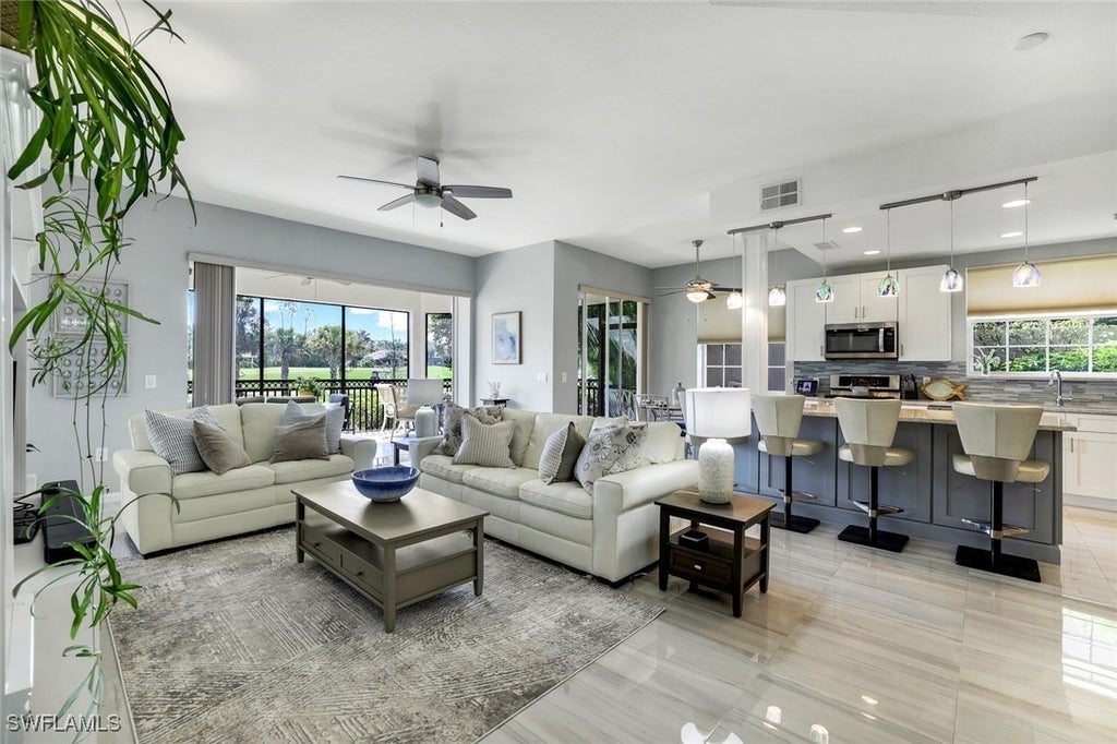 Fresh, bright, and modern, updated with renovated open floor plan, this furnished 3 bed, 2 bath end unit overlooking the beautifully maintained evergreen golf course awaits! Coveted southwest exposure delivers natural light all day and beautiful sunsets. Enjoy the lush landscaped surroundings of this first floor coach home with attached 2 car garage in Deer Crossing, with recently redone outdoor lighting, roofs, lanai screens and exterior paint offering peace of mind and ease of ownership. Serene grey and white tile floor, new kitchen with a fabulous large quartz topped island, super unique art glass pendant lighting, completely opened up to the spacious living and dining room, featuring all new cabinets and appliances, under cabinet lighting, shades of water blue glass tile backsplash, large stainless sink, new pantry with pull out shelves, and integrated trash pull out. New HVAC system installed in 2022. All new beautifully tiled primary bath shower, dual sinks with new quartz counters, lighting, and fixtures complete the cohesive design. 2 guest rooms, situated away from the primary suite, offers privacy your friends and family will enjoy. Rarely seen oversized guest closets and 2 primary closets, offer extraordinary storage, making this home a pleasure to reside, either seasonally or year round. Bike or walk to the amenity rich Fiddler’s Creek Club and Spa, the heart of the community, the updated 54,000 sq ft home to the state of the art gym with new equipment, yoga studio, pilates room, 2 resort pools with waterfalls and slides, 2 restaurants, spa services, fitness classes, full time activity staff providing special events and classes year round, tennis, pickle ball and bocce ball. Miles of sidewalks, all underground utilities, meticulously maintained landscaping, modern coastal designed future building, plus the overall design of the community sets Fiddler’s Creek apart from all others and is a gem of south Naples. CDD Debt Paid in full!! As if this wasn’t enough, there is also an optional beach and/or marina membership available, an extremely rare opportunity to enjoy the beach club at the Marco Beach Ocean Resort and the Marina on Isles of Capri. If you are a golfer, you are in the right place! The Golf Club at Fiddler’s Creek just re-opened with a total turf renovation, re-designed Arthur Hills greens, amazing practice facility anchored by the brand new spectacular private golf clubhouse. Equity memberships are currently available with no waiting list. Fiddler’s Creek is minutes away from the gorgeous white sand beaches of Marco Island and world famous 5th Avenue of Downtown Naples! Don’t miss seeing this special home, in this very special community!!