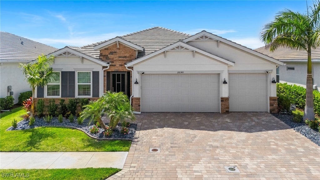 Welcome to 28140 Captiva Shell Loop—an exquisite lakefront home in the highly desirable Seasons at Bonita Springs community. This upgraded 3-bedroom, 3-bathroom residence with a spacious den offers the perfect balance of refined elegance, modern functionality, and resort-style outdoor living. From the moment you arrive, the curb appeal is undeniable with a paver driveway, meticulously manicured landscaping, and a charming stone-accented façade that sets the tone for what’s to come inside.