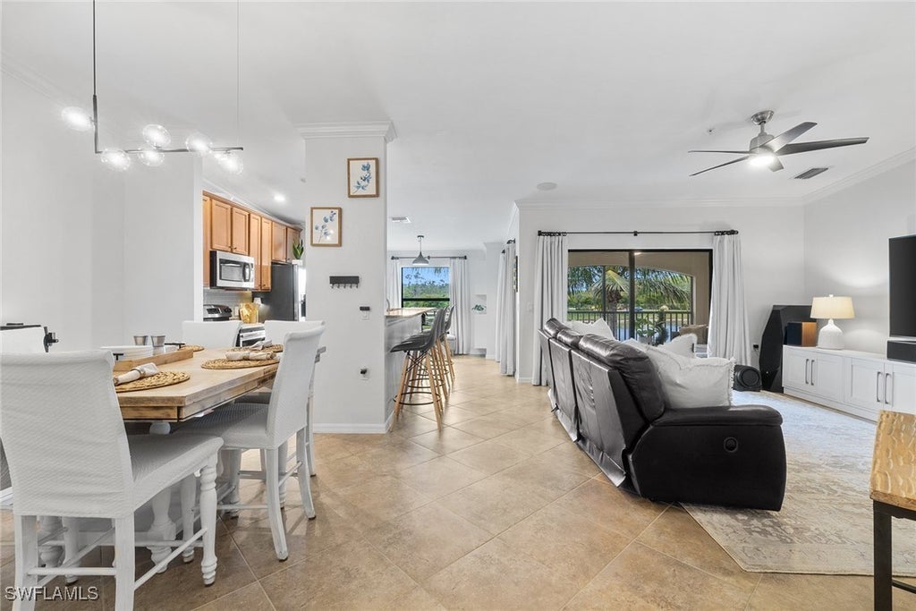 This social membership two-bedroom plus den, two bath features the Diangelo floor plan and includes an incredible and rarely available southern exposure view in the heart of Treviso Bay. Enter the top-floor residence through the spacious front screened Veranda to find extra-high ceilings and a unique blend of elegance and functionality. The wide-open floor plan of this popular model is ideal for entertaining and family living. The open concept flows from kitchen/breakfast nook to dining room and living room, creating one extra-large space. Accentuated by soaring ceilings and wide-line crown molding, it's ideal for hosting parties, movie nights and culinary adventures. Updated LED lighting fixtures and ceiling fans add a touch of contemporary style. For tech lovers, this condominium has been wired post-construction to support four rooms of in-ceiling speaker pairs and 15+ Cat6 data, security and wireless access point location drops, including the repainted and epoxy-coated detached garage. The den is a versatile space, featuring a queen-sized built-in Murphy bed with spacious storage for office supplies and linens and added crown molding, making it ideal for guests and a home office setup. Plus, enjoy the comfort of tastefully done wood-toned flooring in both bedrooms and the den. The kitchen features modern stainless steel GE appliances with a new dishwasher and tiled backsplash. The southern exposure fills the main living area with natural light all day long and the 24-by-12-inch tiled and super-screened back lanai provides a tranquil outdoor retreat where one can gaze at a pristine preserve, open skies and multiple lake water views. Don't miss your chance to own this exceptional condominium offering luxury, comfort and modern convenience in one of the sought-after Naples communities. Conveniently situated, a brief stroll leads to eight pickleball courts one way, and Villa Rilassare the other direction, which offers a host of elite amenities including a resort-style pool featuring cascading waterfalls, eight Har-Tru tennis courts with league play and pro instruction, poolside bar and dining options fully renovated March 2025, rejuvenating spa facilities, as well as tennis and bocce ball courts, elaborate fitness and aerobics facilities, saunas and steam rooms. World-class dining is enjoyed on the 18-hole TPC championship golf course grounds at the opulent clubhouse with an array of social activities on the calendar. Golf is available to social members of Treviso Bay from May to October. Ideally just five miles from vibrant downtown area of Olde Naples and in proximity to pristine beaches of Naples and Marco Island, this residence epitomizes sophisticated coastal living at its finest.