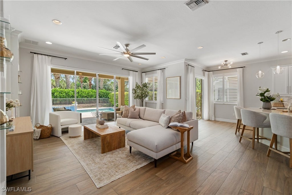 Beautifully renovated, newer construction home in a prime Naples location, nestled within the highly sought-after gated community of Marbella Lakes. Offering 3 bedrooms plus a den and 3 full bathrooms, this stunning residence is filled with natural light and features an open-concept layout with wide plank, wood-look tile flooring and plantation shutters. As you step through the front door, you’re greeted by a dramatic entryway featuring soaring volume ceilings, custom wood beams, and elegant pendant lighting. Beautifully furnished and decorated, this home exudes style and comfort (installed June 2025 — available separately and negotiable*). The beautiful, modernized kitchen features white quartz countertops, marble backsplash, white cabinetry, a wine fridge, and two adjacent dining areas — ideal for both casual meals and entertaining. The spacious split floor plan provides privacy, with the primary suite set apart from the guest bedrooms. The luxurious primary suite features private access to the pool deck, dual walk-in closets with custom built-ins, and a large ensuite bath with dual vanities, a glass-enclosed shower, and a separate soaking tub. Step outside into your private backyard oasis, complete with a resort-style pool with a waterfall feature, stone paver decking, a covered seating area with electric screens for either open air or screened relaxation, and a side yard that’s ideal for pets or outdoor activities. Marbella Lakes is a gated, guarded community offering low HOA fees and exceptional amenities, including a resort-style pool and spa, fitness center, tennis and pickleball courts, indoor and outdoor basketball, billiards, a children’s play area, and an active social calendar. All just minutes from Naples’ famous beaches, world-class dining and shopping on 5th Avenue, and located within an “A-rated” Collier County school district.