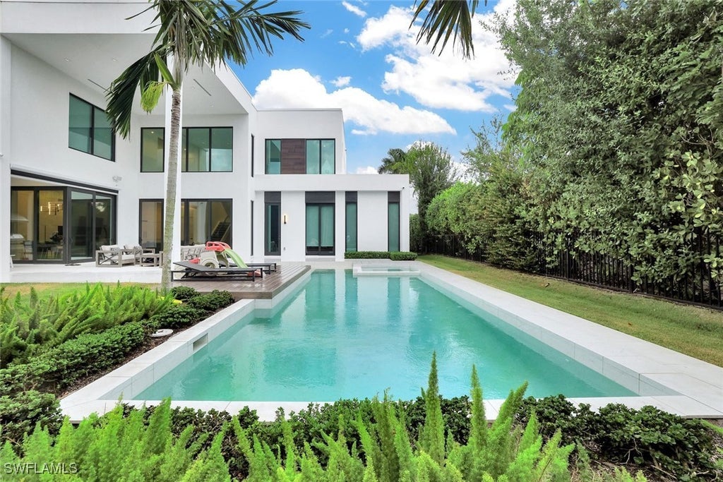 Escape to this architecturally striking Naples retreat designed by HLevel Architecture and crafted by Borelli Construction. Completed in 2021, this luxury vacation rental offers a seamless blend of modern design and comfort, perfect for families or couples looking to unwind in style.The spacious first floor welcomes you with soaring ceilings, natural light from expansive windows, and beautifully finished oak flooring. The open-concept great room flows into a gourmet kitchen featuring flat-panel custom cabinetry, quartz countertops, a walk-in pantry, and top-of-the-line Wolf and Sub-Zero appliances—ideal for entertaining or enjoying a cozy night in. The main-level primary suite opens to peaceful views of the pool and offers a spa-like bath and dual walk-in closets. Upstairs, guests will find three private en-suite bedrooms, a second laundry room, and a large loft-style lounge—perfect for movie nights or quiet relaxation. Step outside to your private oasis with a covered lanai, outdoor kitchen, sleek pool and spa, and a spacious backyard designed for laid-back afternoons or sunset cocktails. Located in the exclusive Moorings neighborhood, guests enjoy access to a private beach park and are just minutes from Naples’ best dining, shopping, and galleries.