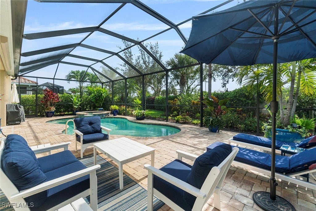 Outstanding value—listed well below appraisal value on a highly sought-after private corner lot! Nestled behind lush tropical landscaping, this beautifully updated two-bedroom plus den, two-bath residence offers everyday luxury in a true resort-style setting. The flexible den, easily converted into a third bedroom, adds versatility to the floor plan. Start your mornings with breathtaking sunrises from the east-facing, expanded lanai, complete with a saltwater pool, spa, and newly installed heater for year-round enjoyment. The professionally landscaped yard, with manicured gardens and privacy hedges, provides a serene backdrop with no homes across the street. Inside, the freshly painted interior features tile flooring in the main living areas and matching luxury vinyl in the bedrooms and den for a cohesive, modern aesthetic. Soaring 11- and 12-foot ceilings in the main living spaces are highlighted by elegant crown molding. The chef’s kitchen is a standout, featuring granite countertops, a stunning glass-and-tile backsplash, soft-close drawers, under-cabinet lighting, and a center island with breakfast bar. A spacious eat-in area overlooks the private pool oasis. Recent upgrades include a new stainless-steel refrigerator and dishwasher. The primary suite is a true retreat, offering dual walk-in closets, a linen closet, private water closet, dual sinks with granite countertops, soft-close drawers, and a luxurious walk-in frameless glass and tile shower with multiple shower heads. Additional highlights include a newer air conditioner (2021), new washer and dryer, and a generous two-car garage with built-in storage racks. Impact-resistant front windows, hurricane screens, and accordion shutters provide added peace of mind. Designed for both relaxation and recreation, The Quarry is a vibrant, amenity-rich community offering boating, water skiing, and kayaking, along with a resort-style pool, lap pool, state-of-the-art fitness and wellness center, tennis, pickleball, bocce, and on-site dining at the Tiki Bar and Clubhouse. Golfers will appreciate the privately owned Quarry Golf Club, a par-72 championship course designed by Hurdzan and Fry, along with a recently updated clubhouse, grill, and dining rooms. Social and golf memberships are optional, but immediately available! From its serene, private setting and thoughtful upgrades to access to world-class amenities, this house truly checks all the boxes. Don’t miss the chance to claim your slice of the Southwest Florida lifestyle!