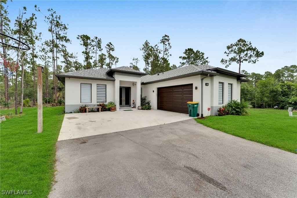 Beautiful 3 bedrooms + Den home built in 2023, situated in an oversize 2.73 lot! As you enter the house through the tall french doors, you will notice the open floor plan, a spacious living room with tile throughout the house, a fresh white kitchen with quartz countertop, a waterfall island, beautiful light colored backsplash, and 42" wood cabinets, soaring high tray ceilings, beautiful crown molding on main living area and master bedroom, 6" baseboards throughout, 8-ft doors, and a beautiful touch of modern with waterfall faucets in the bathrooms. The Spacious master suite features two walk-in closets. Resent Updates include Reverse Osmosis Water System, Termites treatment system, and a shed in the backyard. Conveniently located in the rapidly growing Golden Gate Estates area