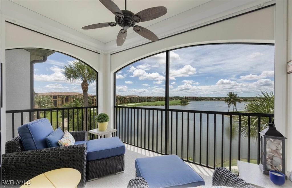 Discover this stunning top floor Bellini 2 BR + Den condo offered Turnkey Furnished and includes a Full Social Membership. Styled in coastal flair with an open, light filled layout for comfort and sophistication. From your private lanai take in Florida's sunsets overlooking a lake, the 1st hole of the golf course and the beautiful clubhouse beyond. Steps from the amenities you are at the heart of an active resort style lifestyle. Adorned with upscale new lighting and decor, including a brand-new bed set and mattress in the owner's suite. Recent enhancements include the installation of two Storm Smart Screens on the lanai for the ultimate hurricane rated protection that protects from UV rays and the bright Southwest Florida sun, all while allowing for visibility and the influx of natural light. and the added benefit of a large storage closet right outside your front door. Peace of mind for new buyer...Home includes a transferrable Gold Home-Tech Service Warranty. Indulge in the resort-style swimming pool, complete with a stunning cascading rock waterfall and lap lanes, or unwind in the inviting hot tub. The fitness center is open daily and offers a variety of robust fitness classes. Enjoy the screened Tiki Bar and Grill, open seven days a week, or take advantage of the attentive waitstaff at the pool for a delightful meal and refreshing cocktail. With 8 Har-Tru, lighted tennis courts and a vibrant tennis program, there are ample recreational options available. New pickleball and bocce ball facilities are also set to be introduced in the coming months to enhance social engagement within the community. Social members enjoy access to the championship-style golf course from May thru October and includes all other amenities. The clubhouse features both formal and informal dining options, ensuring a delightful culinary experience complemented by a robust schedule of events held monthly, if not weekly. Bonita National is pet-friendly, with picturesque sidewalks throughout the community, making it ideal for leisurely strolls. Nestled on a serene preserve, Bonita National offers a peaceful environment and is ideally located close to RSW, Naples and Ft. Myers Beach. Additionally, Midtown is currently under development—a 30-acre community designed for pedestrian-friendly exploration, complete with boutiques, coffee shops, restaurants, and much more. The community is freshly painted to welcome you home.